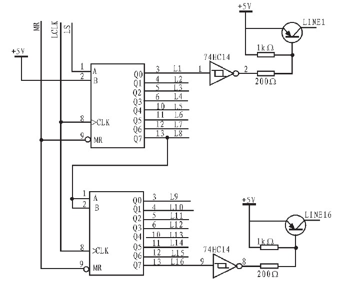 采用逐行掃描的方式,當(dāng)全部列信號(hào)準(zhǔn)備就緒后,控制信號(hào)鎖存器輸出,相應(yīng)的行信號(hào)應(yīng)同時(shí)跟上。由于采用點(diǎn)陣的行為共陽(yáng)極,行選的作用就是為待點(diǎn)亮行提供電源。8位移位寄存器方法的行選電路如圖2所示。該電路中LS為串行行選信號(hào),MR為74HC164的清零信號(hào),LCLK為行選同步時(shí)鐘。74HC164的輸出經(jīng)反相后控制三機(jī)管的導(dǎo)通與截止,從而分別控制第1行LINE1至第16行LINE16與電源接通。從極端情況來(lái)看,驅(qū)動(dòng)功率應(yīng)滿足1行全部32個(gè)LED點(diǎn)亮的要求,盡管LED點(diǎn)陣要求單點(diǎn)驅(qū)動(dòng)電流在10~20 mA,但由于采用1/16占空比的動(dòng)態(tài)掃描顯示方式,單個(gè)LED的瞬時(shí)電流即使未100mA,實(shí)際平均電流不到7 mA,因此驅(qū)動(dòng)電流大于3 A即可。供方部分應(yīng)采用達(dá)林頓管或開(kāi)關(guān)管。
