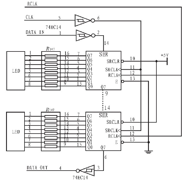列驅(qū)動(dòng)電路由集成電路74HC595構(gòu)成。它具有一個(gè)8位串入并出的移位寄存器和一個(gè)8位輸出鎖存器的結(jié)構(gòu),而且一位寄存器和輸出鎖存器的控制是各自獨(dú)立的,可以實(shí)現(xiàn)在顯示本行各列數(shù)據(jù)的同時(shí),傳送下一行的列數(shù)據(jù),即達(dá)到重疊處理的目的。