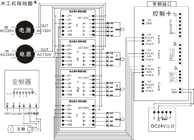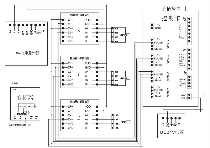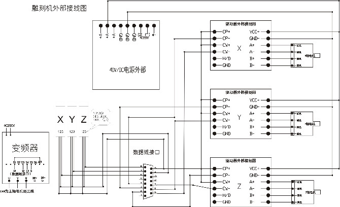 下面是接線(xiàn)圖紙,可以適合木工雕刻機(jī),廣告雕刻機(jī),石材雕刻機(jī)等各種雕刻機(jī)的接線(xiàn)方法。