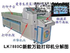 萬(wàn)能打印機(jī)突破了數(shù)碼印刷技術(shù)瓶頸,是傳統(tǒng)印刷機(jī)的替代產(chǎn)品,它不受任何材料限制,可以在瓷板、玻璃、亞克力、PVC、ABS、有機(jī)板、金屬、木板、塑料塑膠、石材、皮革、建材、裝飾裝修材料、硅膠、3D立體畫光柵板、光柵片及其它帆布、油畫布、燈箱布、地板革、T恤、紡織品等表面進(jìn)行彩色照片級(jí)印刷。不論是簡(jiǎn)單的色塊、文字、圖案,全彩色圖案或是具有過(guò)度漸變色的圖案,都能一次印刷完成,無(wú)需制版、無(wú)需曬版和重復(fù)套色,高效快捷應(yīng)用領(lǐng)域非常廣泛。