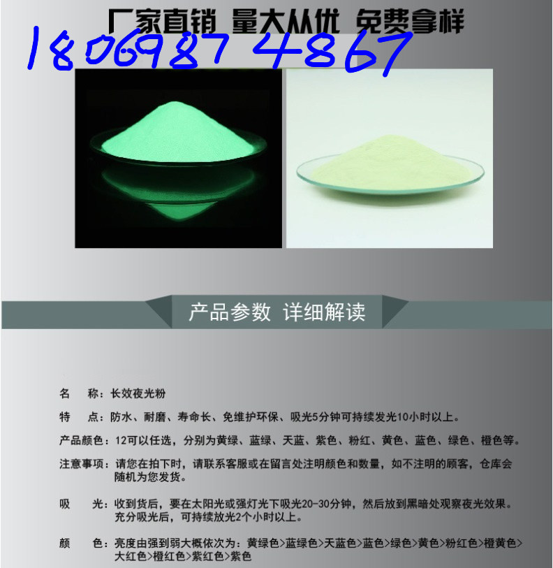 注:一般高亮夜光粉,余暉時(shí)間不會(huì)長(zhǎng),但是本公司產(chǎn)品特點(diǎn)就是吸光蓄光能力強(qiáng),余暉時(shí)間超過12個(gè)小時(shí)。普及下,一般人眼看到的光的強(qiáng)的比較低為3mcd/㎡,本公司內(nèi)的任何一系列產(chǎn)品,12小時(shí)后,余暉強(qiáng)度為60 mcd/㎡以上。